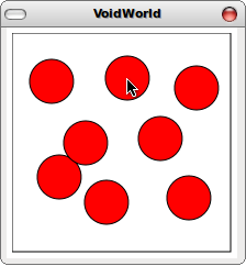 Below is a simple example of aVoidWorldthat adds a new point at each mouse click. The world contains aSceneand a newCircleis placed for each"button-down"event received.import image.*; import world.VoidWorld; public class MousePointsVoidWorld extends VoidWorld{ // Simple Main Program public static void main(String[] args) { new MousePointsVoidWorld().bigBang(); } // The inner Scene Scene scene = new EmptyScene(200, 200); // Create a new World MousePointsVoidWorld(){} // Draw by returning the inner Scene public Scene onDraw(){ return this.scene; } // On a mouse click add a circle to the inner Scene public void onMouse(int x, int y, String me){ if(me.equals("button-down")){ this.scene = this.scene.placeImage( new Circle(20, "solid", "red") .overlay(new Circle(20, "outline", "black")), x, y); } } }After a few mouse clicks, the window will look something like this: